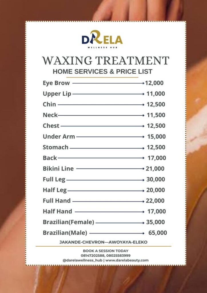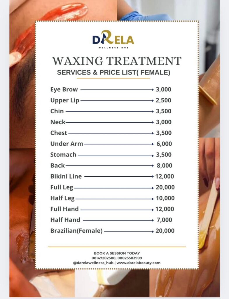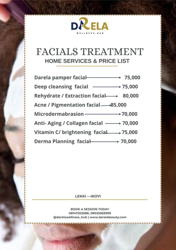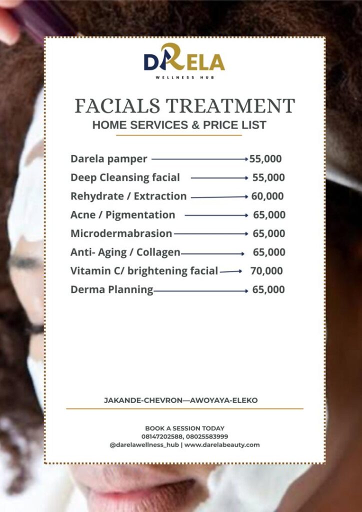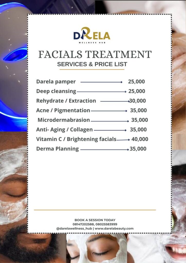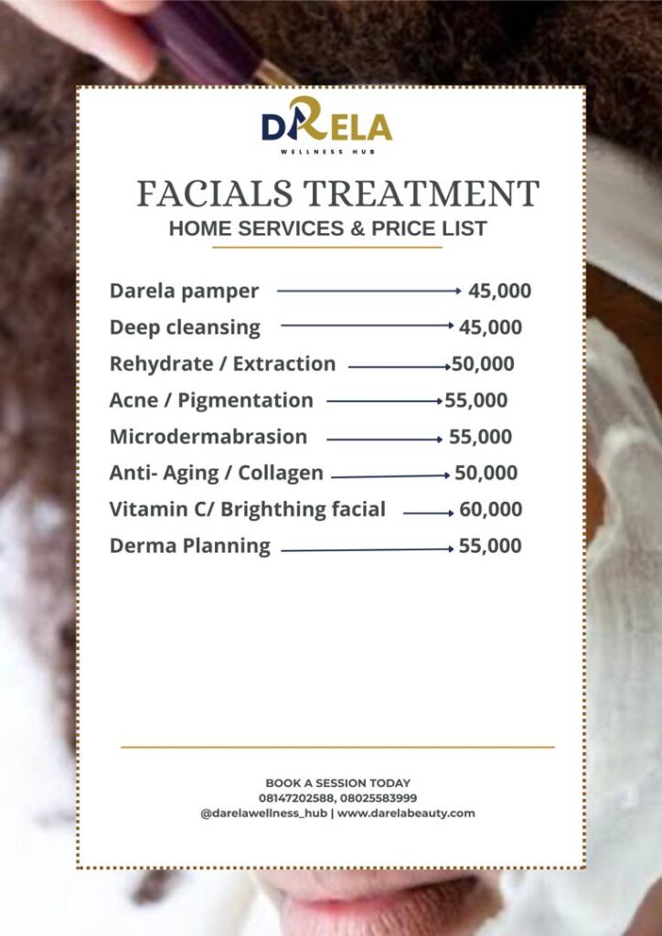 We offer a variety of facial treatments tailored to your unique skincare needs, including Deep Cleansing, Rehydrate/Extraction, Acne/Pigmentation Therapy, Darela Pamper Facial, Microdermabrasion, Gold/Diamond Facial, Anti-Aging/Collagen Boosting, Vitamin C Replacement Facial, Derma Planning, Underarm Treatment, Brightening Facial, and LED Light Therapy Facials. Experience the ultimate in skincare with our expert facial treatments, designed to leave your skin looking and feeling its best.