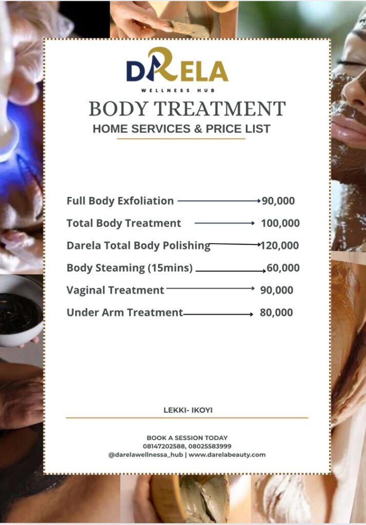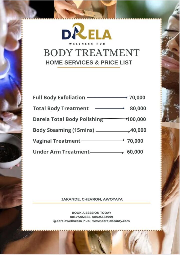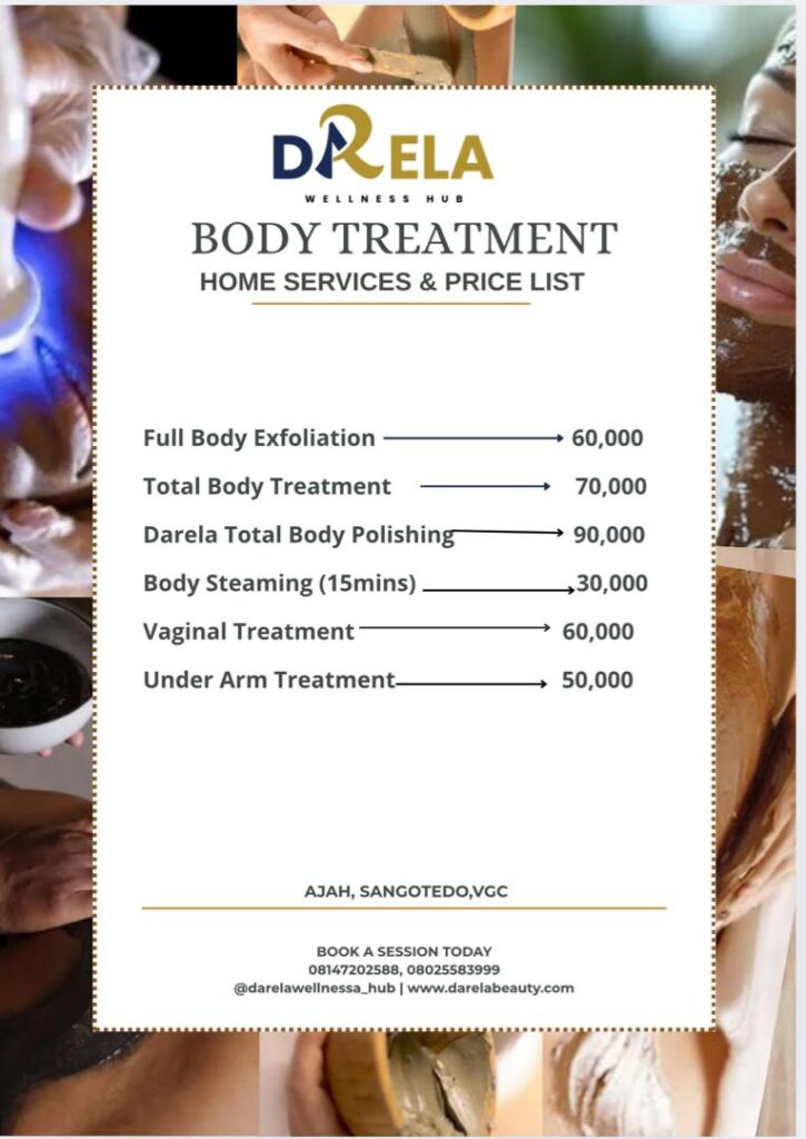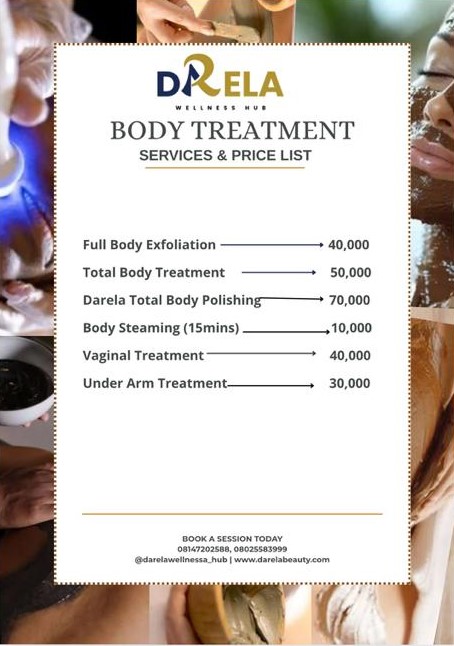 We provide a range of luxurious body treatments tailored to your needs, including: Full Body Exfoliation, Full Body Exfoliation and Steaming, Full Body Exfoliation and Masking, Total Body Treatment, Darela Full Body Polishing, Full Body Steaming. Experience the ultimate in skin rejuvenation and relaxation with our expertly crafted body treatments, designed to leave your skin radiant and refreshed.